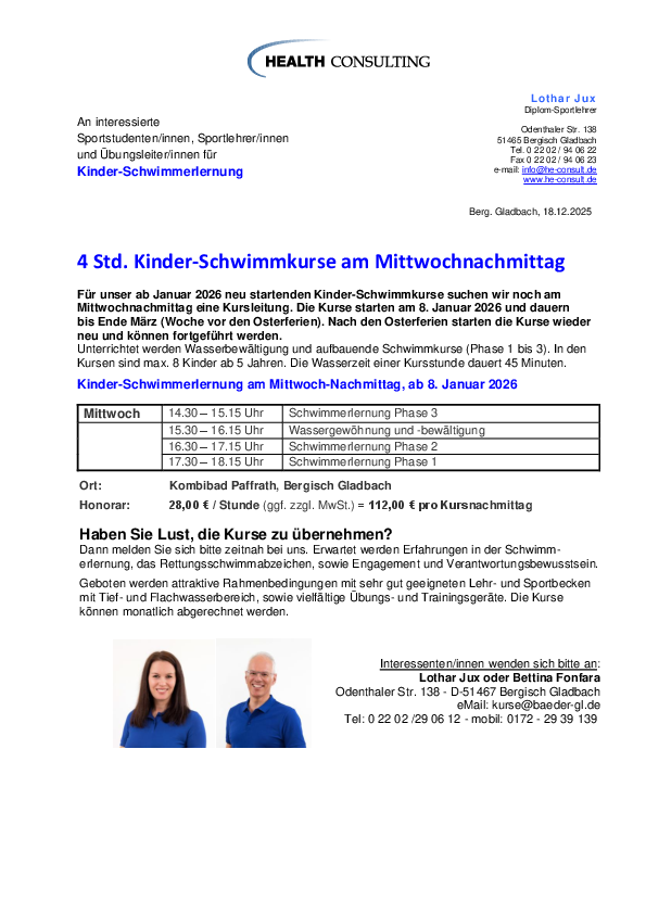Anfang Januar 2026 starten unsere Schwimmerlernungskurse neu. Für die Zeit am Mittwochnachmittag, von 14.30 bis 18.30 Uhr, suchen wir noch eine Kursleitung. Sie können vier Kurse hintereinander unterrichten. Die Wasserzeit pro Kurs ist 45 Minuten. Das Honorar pro Nachmittag ist 112,00 € ggf. zzgl. Mwst.