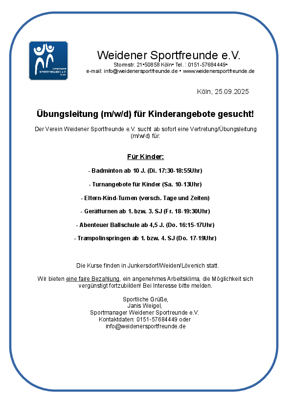 Der Verein Weidener Sportfreunde e.V. sucht ab sofort eine Vertretung/Übungsleitung (m/w/d) für: