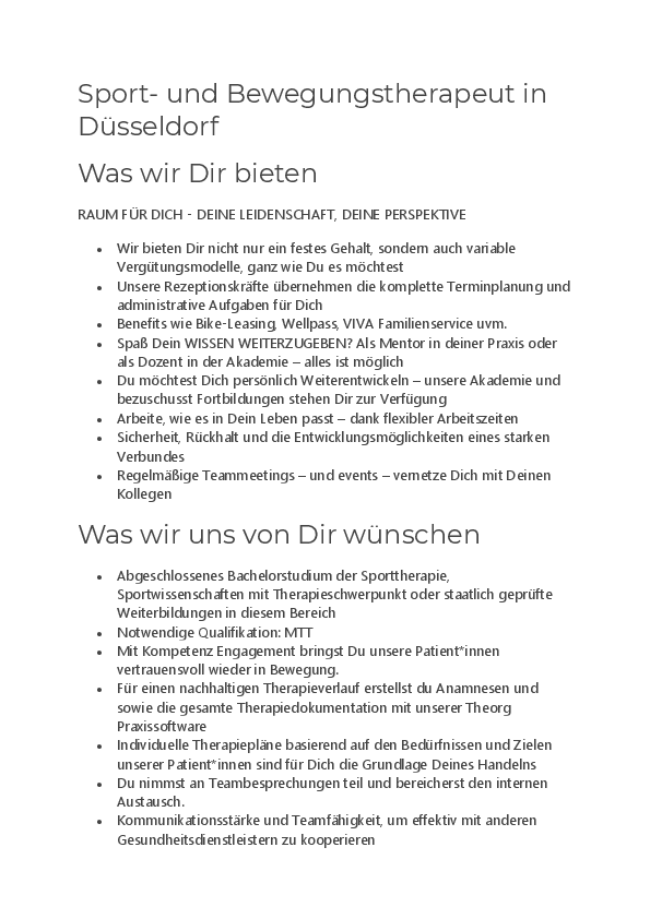 Klingt das gut? Dann bewirb Dich jetzt als Sport- und Bewegungstherapeut in Düsseldorf.