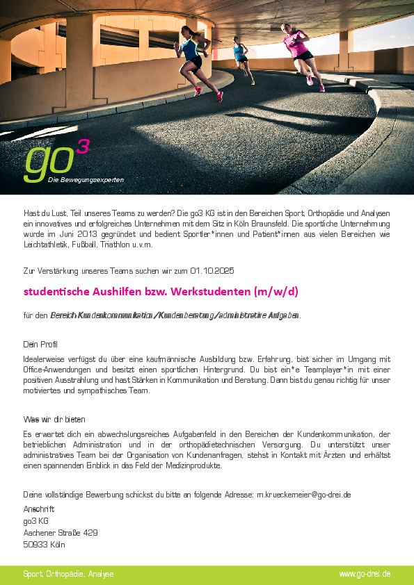 Die go3 KG ist in den Bereichen Sport, Orthopädie und Analysen ein innovatives und erfolgreiches Unternehmen mit dem Sitz in Köln Braunsfeld. Die sportliche Unternehmung wurde im Juni 2013 gegründet und bedient Sportler*innen und Patient*innen aus vielen Bereichen wie Leichtathletik, Fußball, Triathlon u.v.m.