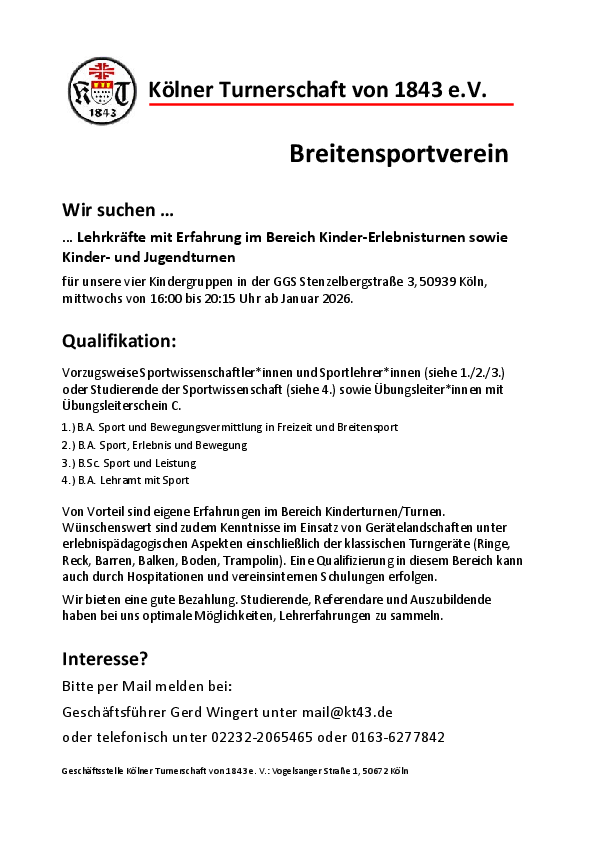 Die Kölner Turnerschaft von 1843 e.V. sucht ab sofort Lehrkräfte mit Erfahrung im Bereich Kinder-Erlebnisturnen sowie Kinder- und Jugendturnen für unsere vier Kindergruppen in der GGS Stenzelbergstraße 3, 50939 Köln. Die Gruppen finden mittwochs von 16:00 bis 20:15 Uhr statt.