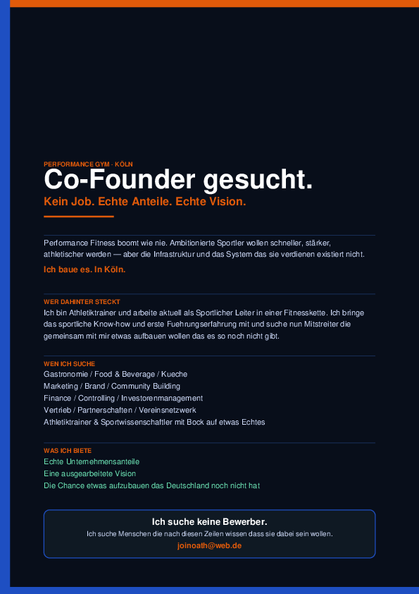 Ich suche Co-Founder mit Hintergrund oder Netzwerk zu Gastronomie, Marketing, Finance oder Vertrieb — aber auch Athletiktrainer und Sportwissenschaftler die Bock haben etwas Echtes aufzubauen.