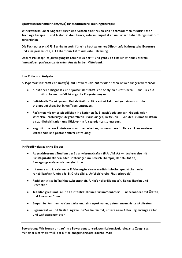 •Interesse und idealerweise Erfahrung in einem medizinisch-therapeutischen oder rehabilitativen Umfeld (z. B. Orthopädie, Unfallchirurgie, Physiotherapie).