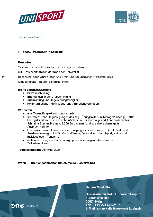 Der UniSport Köln sucht ab Mai 2026 eine:n Pilates Trainer:in. Bitte bei Sabine Muskalla, +49 221 470-2107, s.muskalla@verw.uni-koeln.de, melden.