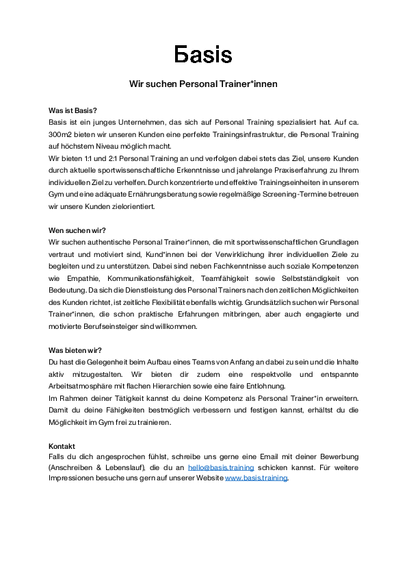 Wir sind auf der Suche nach authentischen Personal Trainer*innen, die mit sportwissenschaftlichen Grundlagen vertraut sind und mit viel Motivation und Engagement dabei helfen möchten, die individuellen Ziele unserer Kund*innen zu verwirklichen. Wir legen großen Wert auf Fachkenntnisse, aber auch auf soziale Kompetenzen wie Empathie, Kommunikationsfähigkeit, Teamfähigkeit sowie Selbstständigkeit. Da sich die Dienstleistung des Personal Trainers nach den zeitlichen Möglichkeiten des Kunden richtet, ist zeitliche Flexibilität ebenfalls wichtig. Wir freuen uns über Bewerbungen von Personal Trainern, die schon praktische Erfahrungen mitbringen, aber auch engagierte und motivierte Berufseinsteiger sind willkommen.