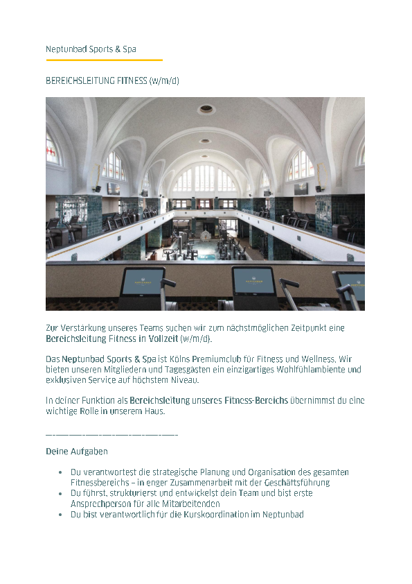 In deiner Funktion als Bereichsleitung unseres Fitness-Bereichs übernimmst du eine wichtige Rolle in unserem Haus.