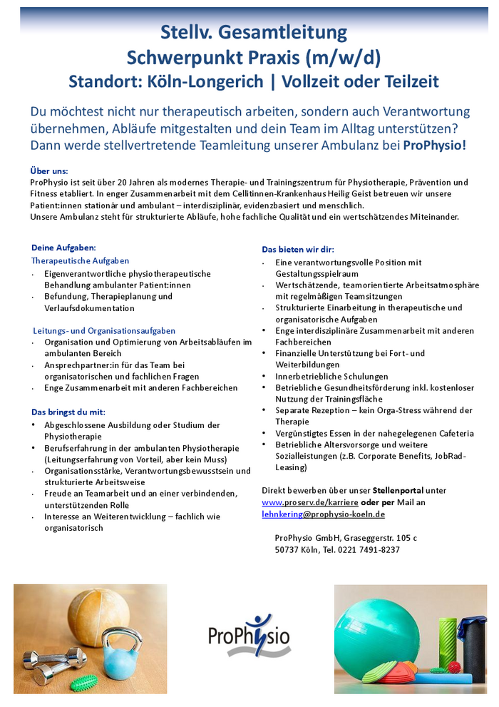- Physiotherapeut:in (m/w/d) für unsere Ambulanz Standort: Köln-Longerich | Vollzeit oder Teilzeit