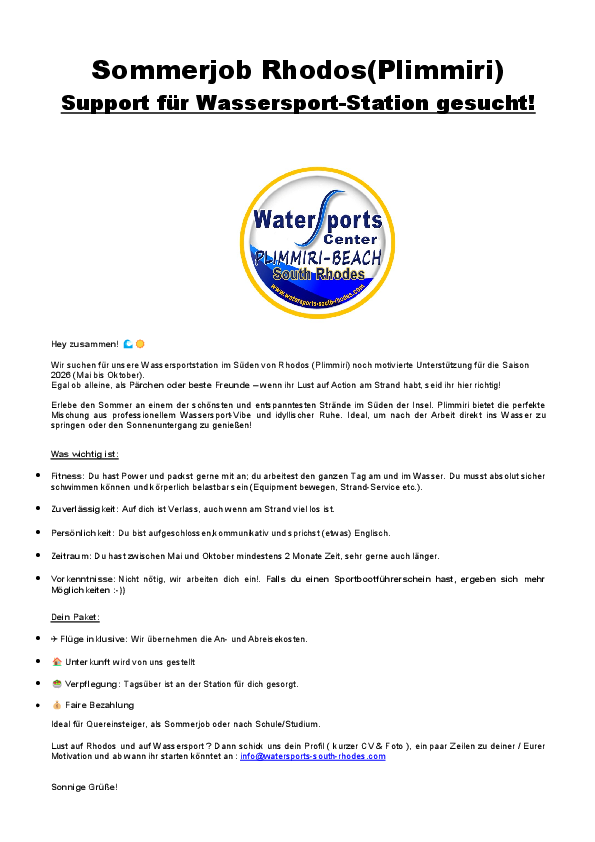 Lust auf Rhodos und auf Wassersport ? Dann schick uns dein Profil ( kurzer CV & Foto ), ein paar Zeilen zu deiner / Eurer Motivation und ab wann ihr starten könntet an : info@watersports-south-rhodes.com