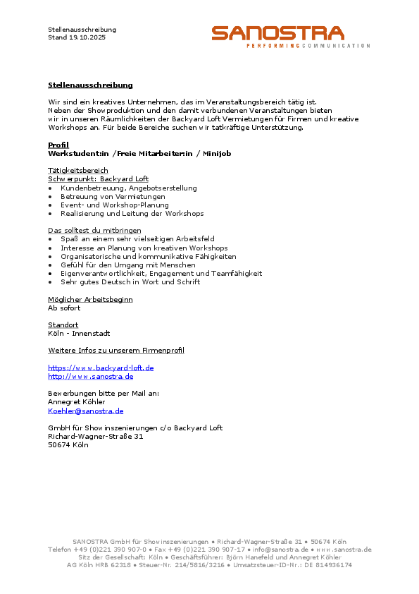 Wir sind ein kreatives Unternehmen, das im Veranstaltungsbereich tätig ist. Neben der Showproduktion und den damit verbundenen Veranstaltungen bieten wir in unseren Räumlichkeiten der Backyard Loft Vermietungen für Firmen und kreative Workshops an. Für beide Bereiche suchen wir tatkräftige Unterstützung.