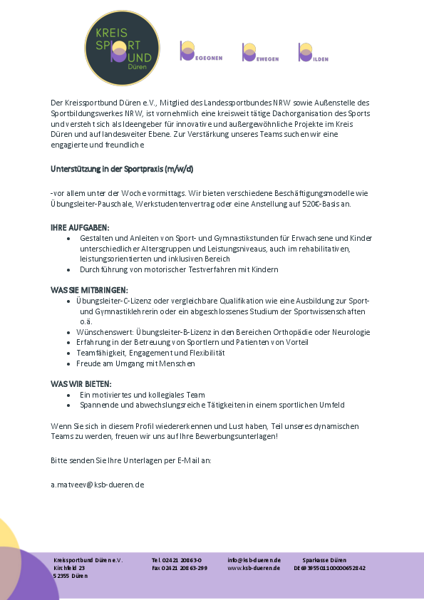 Der Kreissportbund Düren e.V., Mitglied des Landessportbundes NRW sowie Außenstelle des Sportbildungswerkes NRW, ist vornehmlich eine kreisweit tätige Dachorganisation des Sports und versteht sich als Ideengeber für innovative und außergewöhnliche Projekte im Kreis Düren und auf landesweiter Ebene. Zur Verstärkung unseres Teams suchen wir eine engagierte und freundliche