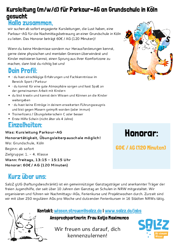 Wir suchen ab sofort engagierte Kursleitungen (m/w/d) für eine Parkour-AG an einer Schule in Köln.