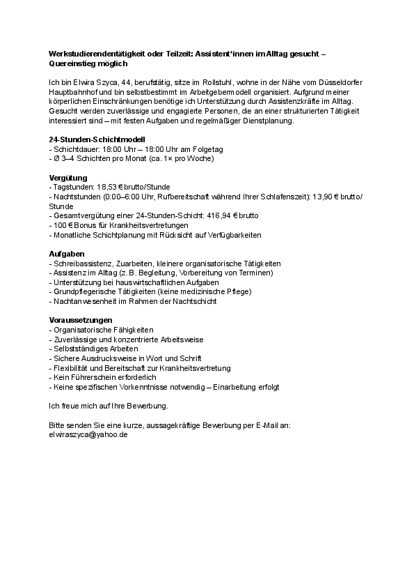 Ich suche flexible Assistent*innen für einen Nebenjob in Düsseldorf Nähe Hbf. Durch komprimierte Wochenstunden (24h pro Schicht 1x die Woche) und Dienstplanwünschen ist diese Tätigkeit ideal neben dem Studium. 18,53€/Std, außer 0-6 Uhr 13,90€ (Schlafenszeit mit Bereitschaft), also 416,94€ für eine 24-Stunden-Schicht. Mehr Infos finden Sie im angehängten pdf.