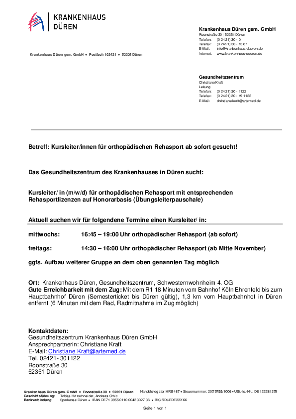 Das Gesundheitszentrum des Krankenhauses in Düren sucht: