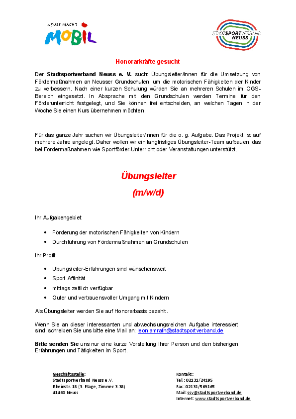 Der Stadtsportverband Neuss e. V. sucht Übungsleiter/innen für die Umsetzung von Fördermaßnahmen an Neusser Grundschulen, um die motorischen Fähigkeiten der Kinder zu verbessern. Nach einer kurzen Schulung würden Sie an mehreren Schulen im OGS-Bereich eingesetzt. In Absprache mit den Grundschulen werden Termine für den Förderunterricht festgelegt, und Sie können frei entscheiden, an welchen Tagen in der Woche Sie einen Kurs übernehmen möchten.