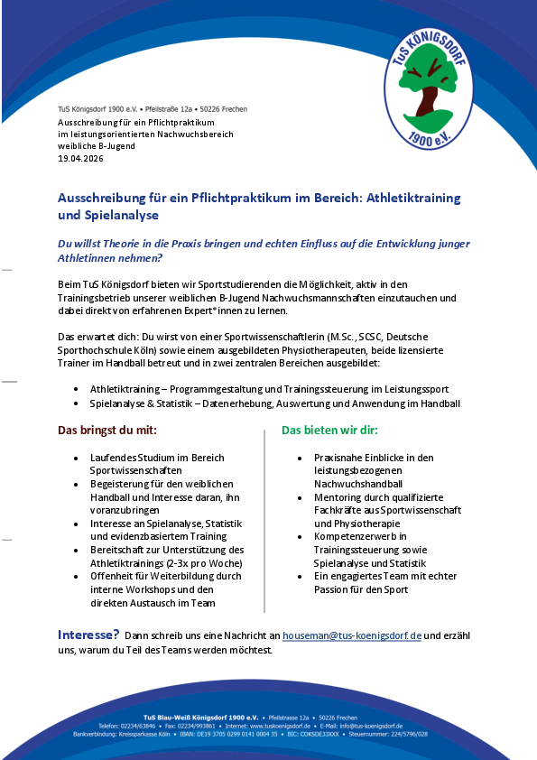 Beim TuS Königsdorf Abteilung Handball bieten wir Sportstudierenden die Möglichkeit, aktiv in den Trainingsbetrieb unserer weiblichen B-Jugend Nachwuchsmannschaften einzutauchen und dabei direkt von erfahrenen Expert*innen zu lernen.