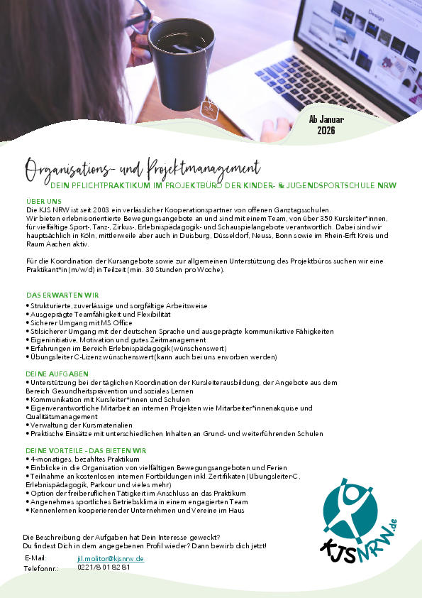Dein Pflichtpraktikum im Projektbüro der Kinder- &Jugendsportschule NRW ab sofort.
