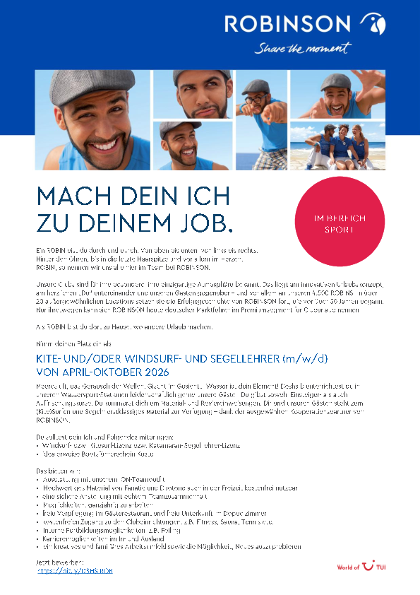 Meeresluft, das Geräusch der Wellen, Gischt im Gesicht… Wasser ist dein Element! Deshalb unterrichtest du in unseren Wassersport-Stationen leidenschaftlich gerne unsere Gäste. Du gibst sowohl Einsteiger- als auch Auffrischungskurse. Du kümmerst dich um Material- und Reviereinweisungen. Dir und unseren Gästen steht zum (Kite)Surfen und Segeln erstklassiges Material zur Verfügung – dank der ausgewählten Kooperationspartner von ROBINSON.