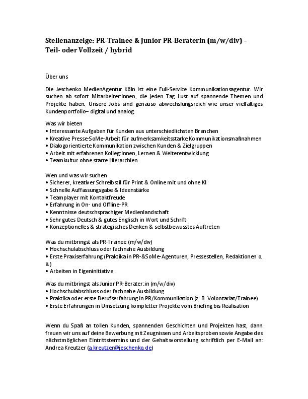 PR-Trainee & PR Junior-Berater Jeschenko MedienAgentur Region Köln/Bonn (Hybrid)