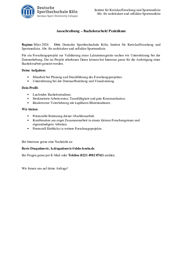 Beginn: März 2026 Ort: Deutsche Sporthochschule Köln, Institut für Kreislaufforschung und Sportmedizin, Abt. für molekulare und zelluläre Sportmedizin