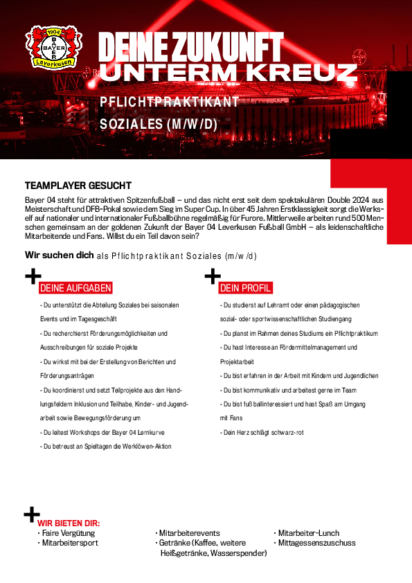 Bayer 04 steht für attraktiven Spitzenfußball – und das nicht erst seit dem spektakulären nationalen Double 2024 aus Meisterschaft und DFB-Pokal sowie dem Sieg im Super Cup. In über 45 Jahren Erstklassigkeit sorgt die Werkself auf nationaler und internationaler Fußballbühne regelmäßig für Furore. Mittlerweile arbeiten rund 500 Menschen gemeinsam an der goldenen Zukunft der Bayer 04 Leverkusen Fußball GmbH – als leidenschaftliche Mitarbeitende und Fans. Willst du ein Teil davon sein?