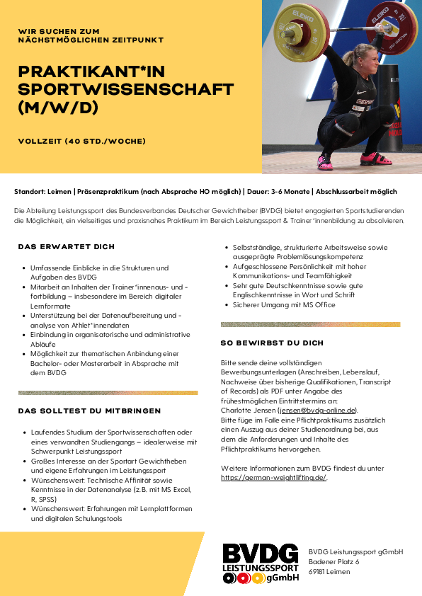 Die Abteilung Leistungssport des Bundesverbandes Deutscher Gewichtheber (BVDG) bietet engagierten Sportstudierenden die Möglichkeit, ein vielseitiges und praxisnahes Praktikum im Bereich Leistungssport & Trainer*innenbildung zu absolvieren.