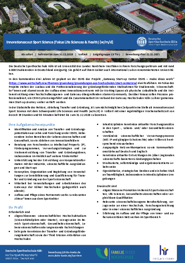 In der Stabsstelle des Rektors, Abteilung Transfer und Gründung, ist zum nächstmöglichen Zeitpunkt eine Stelle als Innovationscout Sport Science mit dem Schwerpunkt Life Sciences and Health (w/m/d) in Vollzeit mit einer regelmäßigen Wochenarbeitszeit von derzeit 39 Stunden und 50 Minuten befristet bis zum 31.12.2028 zu besetzen.