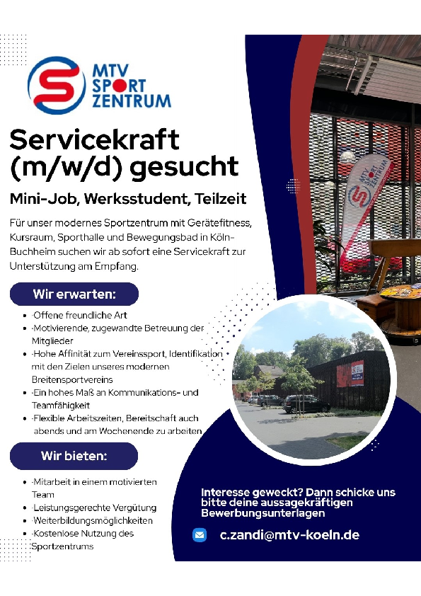 Der MTV Köln 1850 ist Kölns größter Breitensportverein. Wir bewegen über 6000 Mitglieder und Kursteilnehmer in über 60 Sportstätten, vorwiegend im rechtsrheinischen Köln. Für unser modernes Sportzentrum mit Gerätefitness, Kursraum, Sporthalle und Bewegungsbad in Köln-Buchheim suchen wir ab sofort eine Servicekraft zur Unterstützung am Empfang.