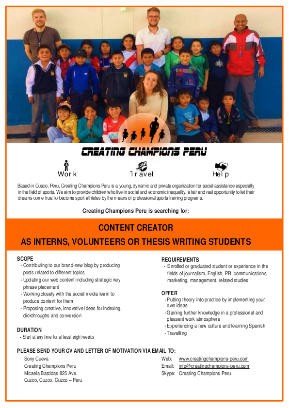 Now it's the opportunity to put everything you have learned in your studies into practice working for a sports project in Cuzco, Peru. Many different positions related to the Marketing field are now available.