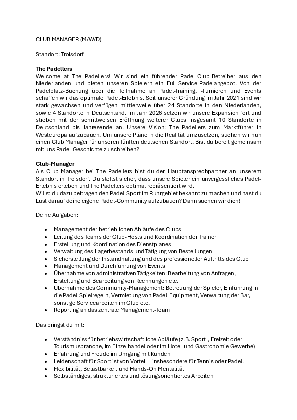 Welcome at The Padellers! Wir sind ein führender Padel-Club-Betreiber aus den Niederlanden und bieten unseren Spielern ein Full-Service-Padelangebot. Von der Padelplatz-Buchung über die Teilnahme an Padel-Training, -Turnieren und Events schaPen wir das optimale Padel-Erlebnis. Seit unserer Gründung im Jahr 2021 sind wir stark gewachsen und verfügen mittlerweile über 24 Standorte in den Niederlanden, sowie 4 Standorte in Deutschland. Im Jahr 2026 setzen wir unsere Expansion fort und streben mit der schrittweisen EröPnung weiterer Clubs insgesamt 10 Standorte in Deutschland bis Jahresende an. Unsere Vision: The Padellers zum Marktführer in Westeuropa aufzubauen. Um unsere Pläne in die Realität umzusetzen, suchen wir nun einen Club Manager für unseren fünften deutschen Standort. Bist du bereit gemeinsam mit uns Padel-Geschichte zu schreiben?
