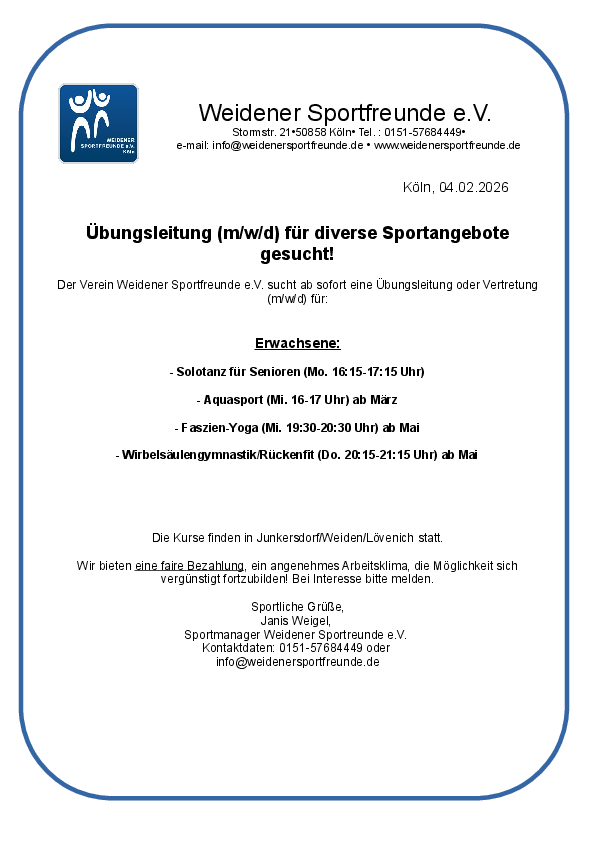 Der Verein Weidener Sportfreunde e.V. sucht ab sofort eine Übungsleitung oder Vertretung (m/w/d) für: