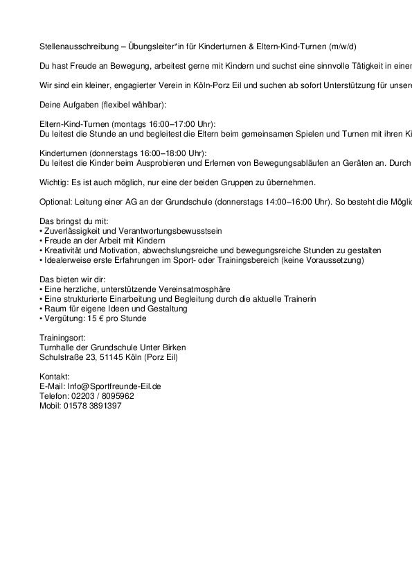 Wir sind ein kleiner, engagierter Verein in Köln-Porz Eil und suchen ab sofort Unterstützung für unsere Turngruppen. Bei uns steht der Spaß an Bewegung, das gemeinsame Erleben und die individuelle Förderung der Kinder im Mittelpunkt.