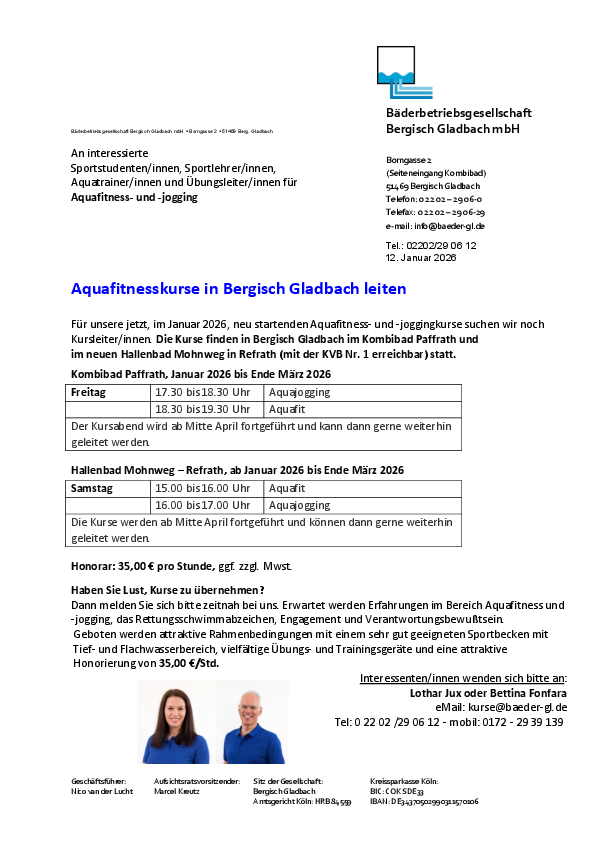 Innerhalb unseres Kurprogramms, das Inhalte von der Frühföderung bis zur Seniorengymnastik im Wasser umfasst, suchen wir noch zwei Kursleiter/innen für Aquafitness und -jogging am Freitagabend (18.30 bis 20.30 Uhr im Kombibad Paffrath) und am Samstagnachmittag in neuen Hallenbad Mohnweg in Refrath.