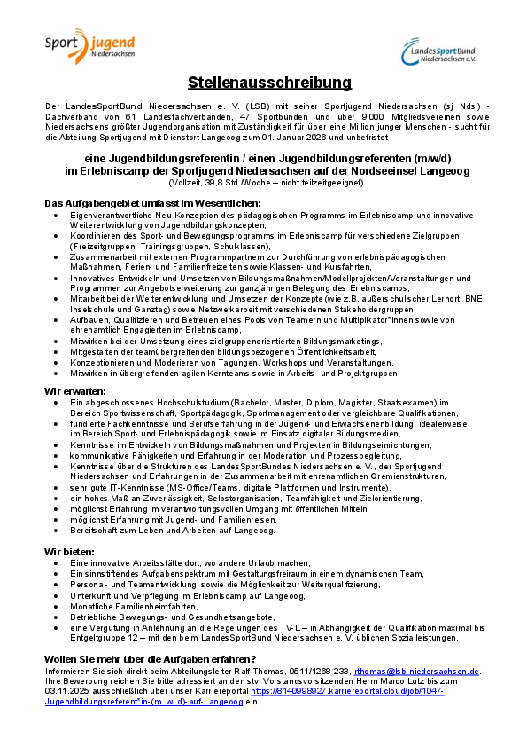 Informieren Sie sich direkt beim Abteilungsleiter Ralf Thomas, +49 511/1268 233, rthomas@lsb-niedersachsen.de. Ihre Bewerbung reichen Sie bitte adressiert an den stv. Vorstandsvorsitzenden Herrn Marco Lutz bis zum 03.11.2025 ausschließlich über unser Karriereportal 8140998927.karriereportal.cloud/job/1047-Jugendbildungsreferent*in-(m_w_d)-auf-Langeoog ein.