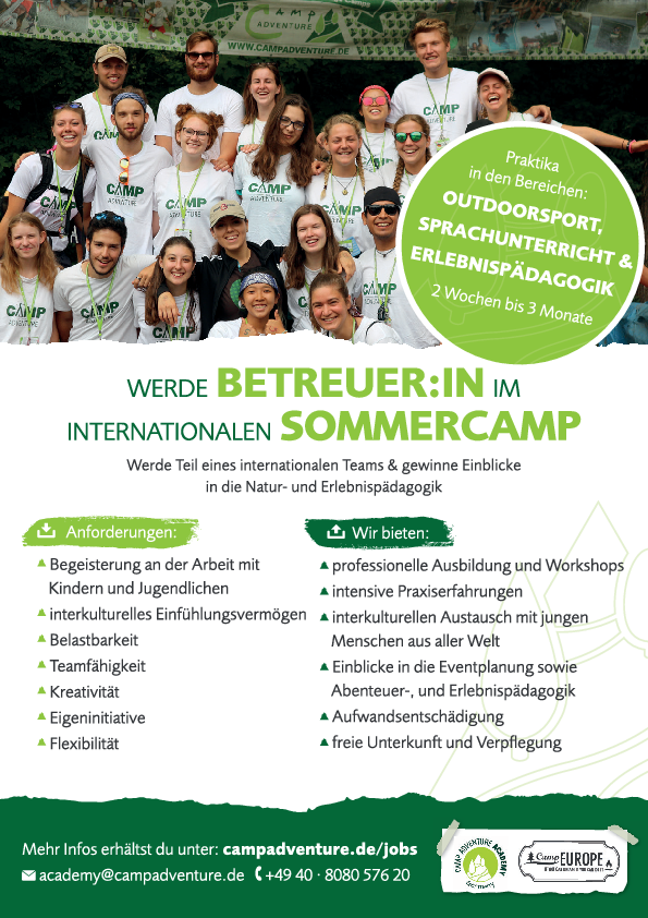 Ausführliche Infos erhältst du per Email oder unter www.campadventure.de/jobs.