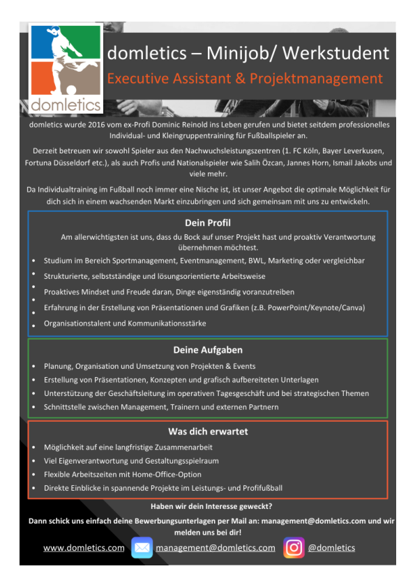 domletics wurde 2016 vom Ex-Profi Dominic Reinold gegründet und steht für professionelles Individual- und Performance-Training im Leistungs- und Profifußball.