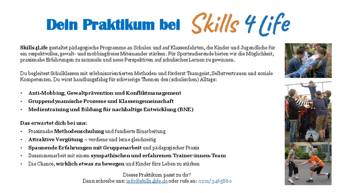 Skills4Life gestaltet pädagogische Programme an Schulen und auf Klassenfahrten, die Kinder und Jugendliche für ein respektvolles, gewalt- und mobbingfreies Miteinander stärken. Für Sportsudierende bieten wir die Möglichkeit, praxisnahe Erfahrungen zu sammeln und neue Perspektiven auf schulisches Lernen zu gewinnen.