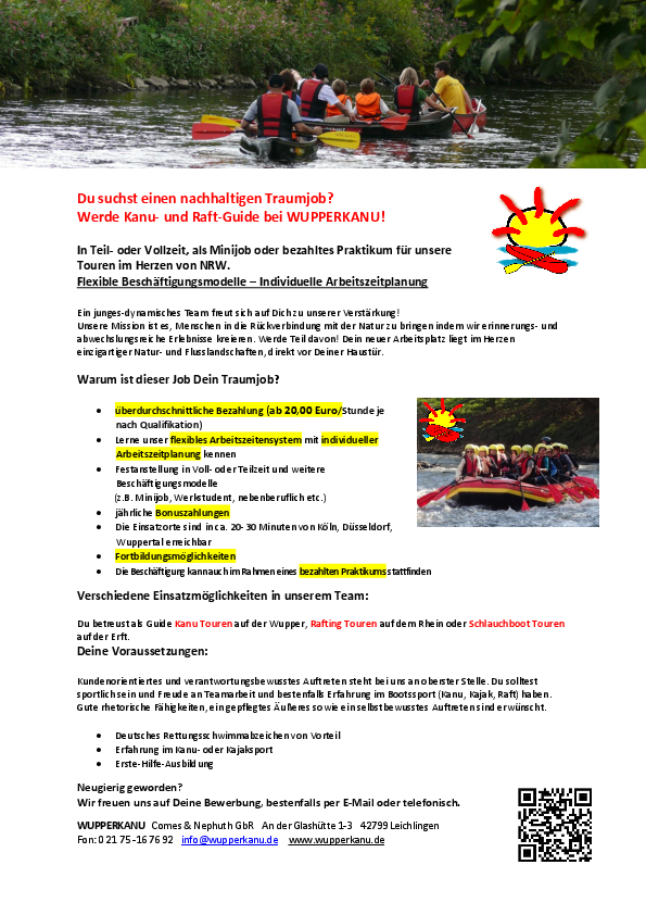 Du suchst einen nachhaltigen Traumjob? Werde Kanu- und Raft-Guide bei WUPPERKANU!