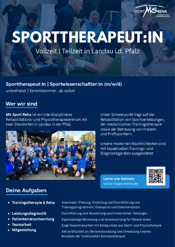 - Sporttherapeut:in oder Sportwissenschaftler:in mit Schwerpunkt Sporttherapie