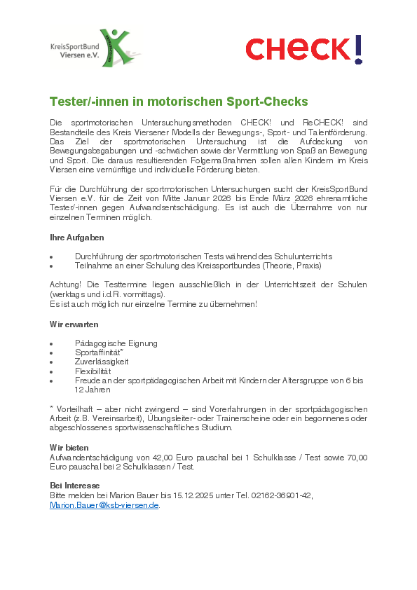 Für die Durchführung der sportmotorischen Untersuchungen sucht der KreisSportBund Viersen e.V. in der Zeit von Mitte Januar 2026 bis Ende März 2026 Honorarkräfte als Tester/-innen. Es ist auch möglich Zeiträume auszuklammern.
