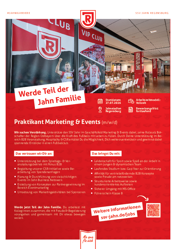 Wir suchen Verstärkung. Unterstütze den SSV Jahn im Geschäftsfeld Marketing & Events als Praktikant (m/w/d) dabei, seine Rolle als Botschafter der Region Ostbayern über die Kraft des Fußballs mit Leben zu füllen. Durch Deine Unterstützung im Bereich B2B Veranstaltung, Hospitality & CSR erhältst Du die Möglichkeit Dich weiterzuentwickeln und gewinnst dabei spannende Einblicke in einen Fußballclub.