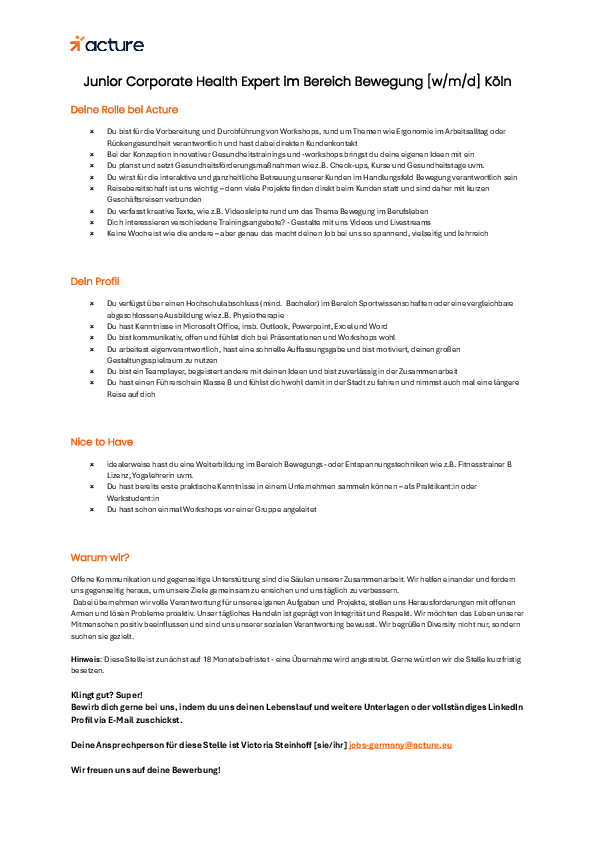 Deine Ansprechperson für diese Stelle ist Victoria Steinhoff [sie/ihr] jobs-germany@acture.eu