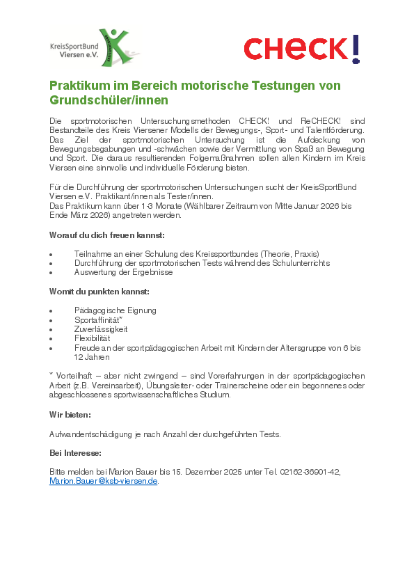 Die sportmotorischen Untersuchungsmethoden CHECK! und ReCHECK! sind Bestandteile des Kreis Viersener Modells der Bewegungs-, Sport- und Talentförderung. Das Ziel der sportmotorischen Untersuchung ist die Aufdeckung von Bewegungsbegabungen und -schwächen sowie der Vermittlung von Spaß an Bewegung und Sport. Die daraus resultierenden Folgemaßnahmen sollen allen Kindern im Kreis Viersen eine sinnvolle und individuelle Förderung bieten.