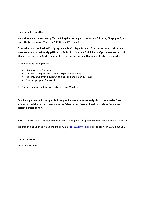 wir suchen eine Unterstützung für die Alltagsbetreuung unseres Vaters (74 Jahre, Pflegegrad 5) und