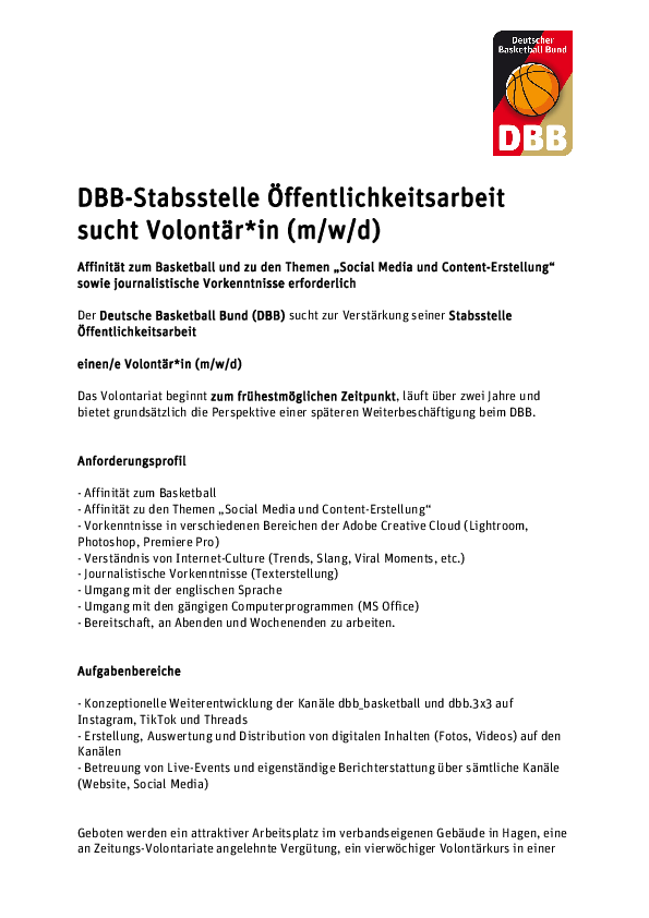 Der Deutsche Basketball Bund (DBB) sucht zur Verstärkung seiner Stabsstelle Öffentlichkeitsarbeit