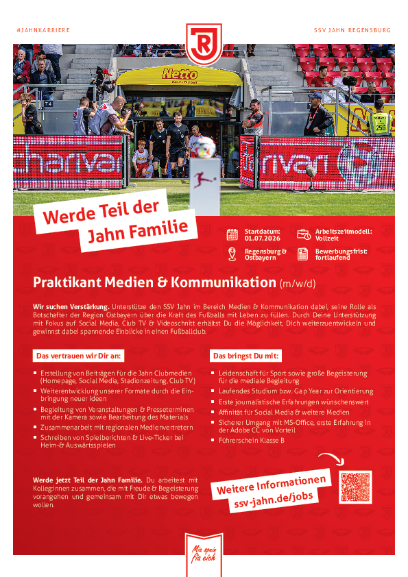 Wir suchen Verstärkung. Unterstütze den SSV Jahn im Bereich Medien & Kommunikation dabei, seine Rolle als Botschafter der Region Ostbayern über die Kraft des Fußballs mit Leben zu füllen. Durch Deine Unterstützung mit Fokus auf Social Media, Club TV & Videoschnitt erhältst Du die Möglichkeit Dich weiterzuentwickeln und gewinnst dabei spannende Einblicke in einen Fußballclub.