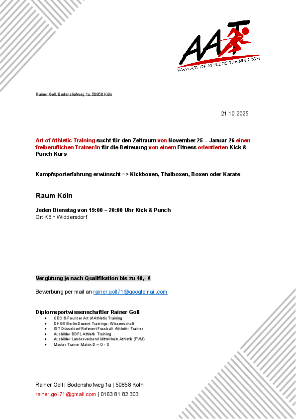 Art of Athletic Training sucht ab dem 04.11.2025 - 13.01.2026 einen freiberuflichen Trainer für einen Fitness orientierten