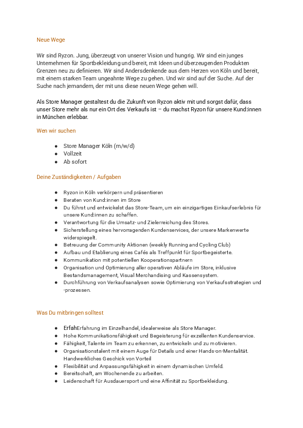 Als Store Manager gestaltest du die Zukunft von Ryzon aktiv mit und sorgst dafür, dass unser Store mehr als nur ein Ort des Verkaufs ist – du machst Ryzon für unsere Kund:innen in München erlebbar.