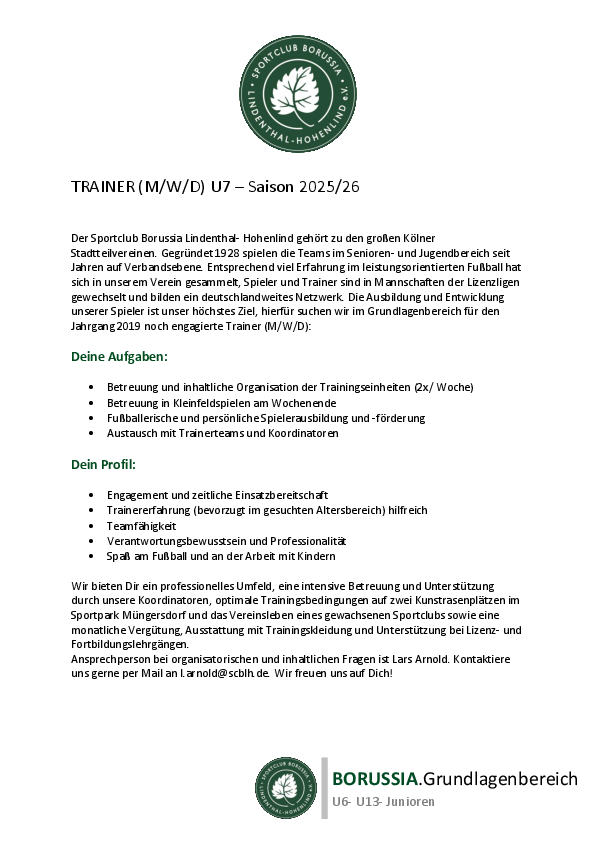 Der Sportclub Borussia Lindenthal- Hohenlind gehört zu den großen Kölner Stadtteilvereinen. Gegründet 1928 spielen die Teams im Senioren- und Jugendbereich seit Jahren auf Verbandsebene. Entsprechend viel Erfahrung im leistungsorientierten Fußball hat sich in unserem Verein gesammelt, Spieler und Trainer sind in Mannschaften der Lizenzligen gewechselt und bilden ein deutschlandweites Netzwerk. Die Ausbildung und Entwicklung unserer Spieler ist unser höchstes Ziel, hierfür suchen wir im Grundlagenbereich für den Jahrgang 2019 noch engagierte Trainer (M/W/D):