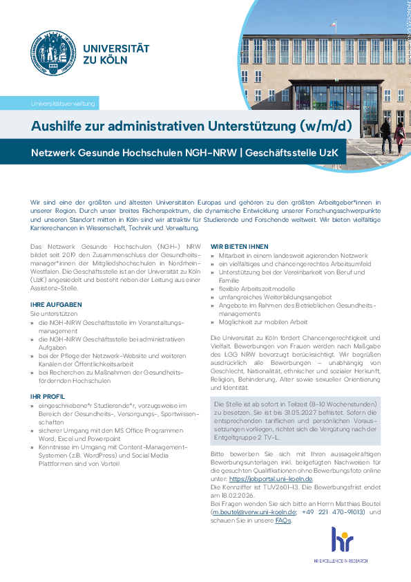 Das Netzwerk Gesunde Hochschulen (NGH-) NRW bildet seit 2019 den Zusammenschluss der Gesundheitsmanager*innen der Mitgliedshochschulen in Nordrhein-Westfalen. Die Geschäftsstelle ist an der Universität zu Köln (UzK) angesiedelt und besteht neben der Leitung aus einer Assistenz-Stelle, die ab sofort in Teilzeit (8-10 Wochenstunden; befristet bis 31.05.2027; Entgeltgruppe 2 TV-L) zu besetzen ist.