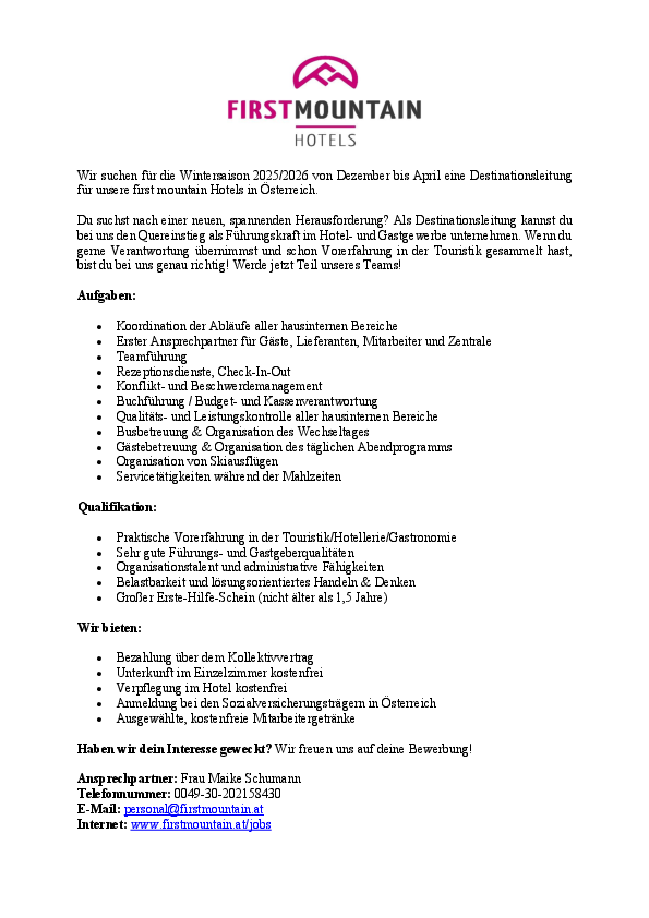Wir suchen für die Wintersaison 2025/2026 von Dezember bis April eine Destinationsleitung für unsere first mountain Hotels in Österreich.